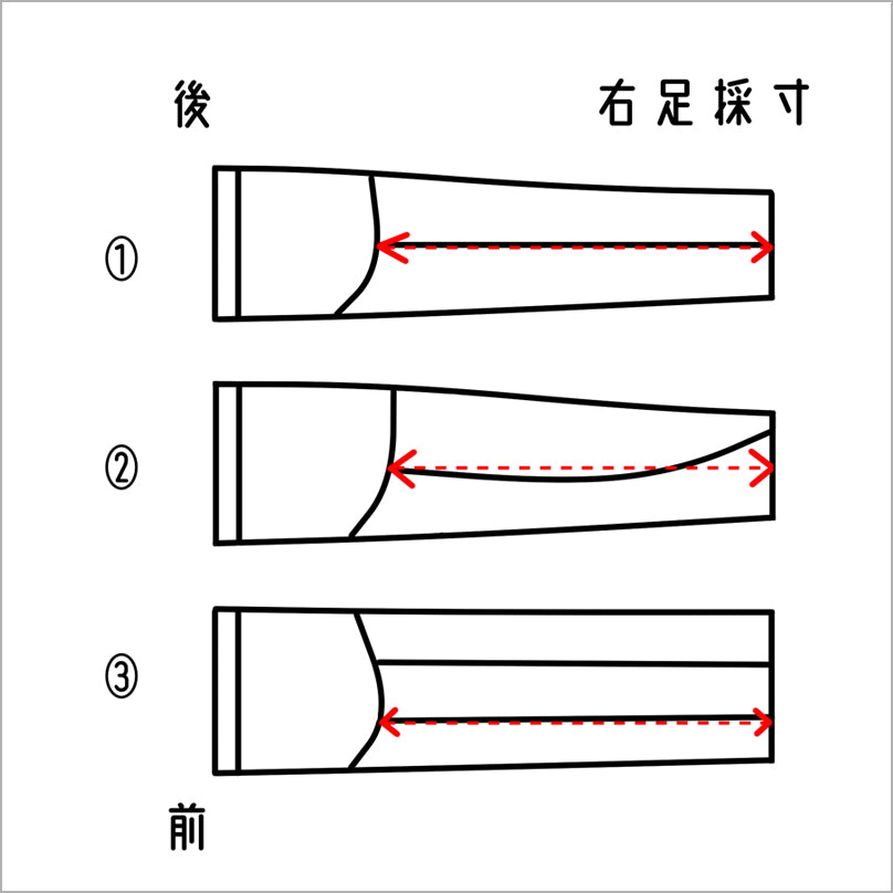 左足で採寸すると長さが変わる場合があるので、必ず右足で測りましょう。
