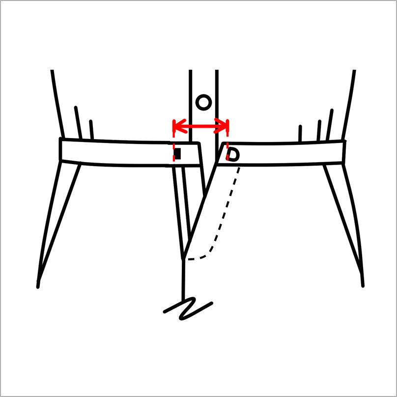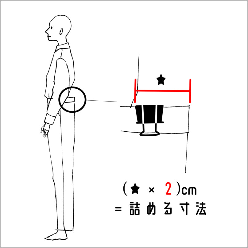 つまんで測っているので実際に詰める寸法は★×2になります。ウエスト出しの場合は1人で測る場合と同じやり方です。
